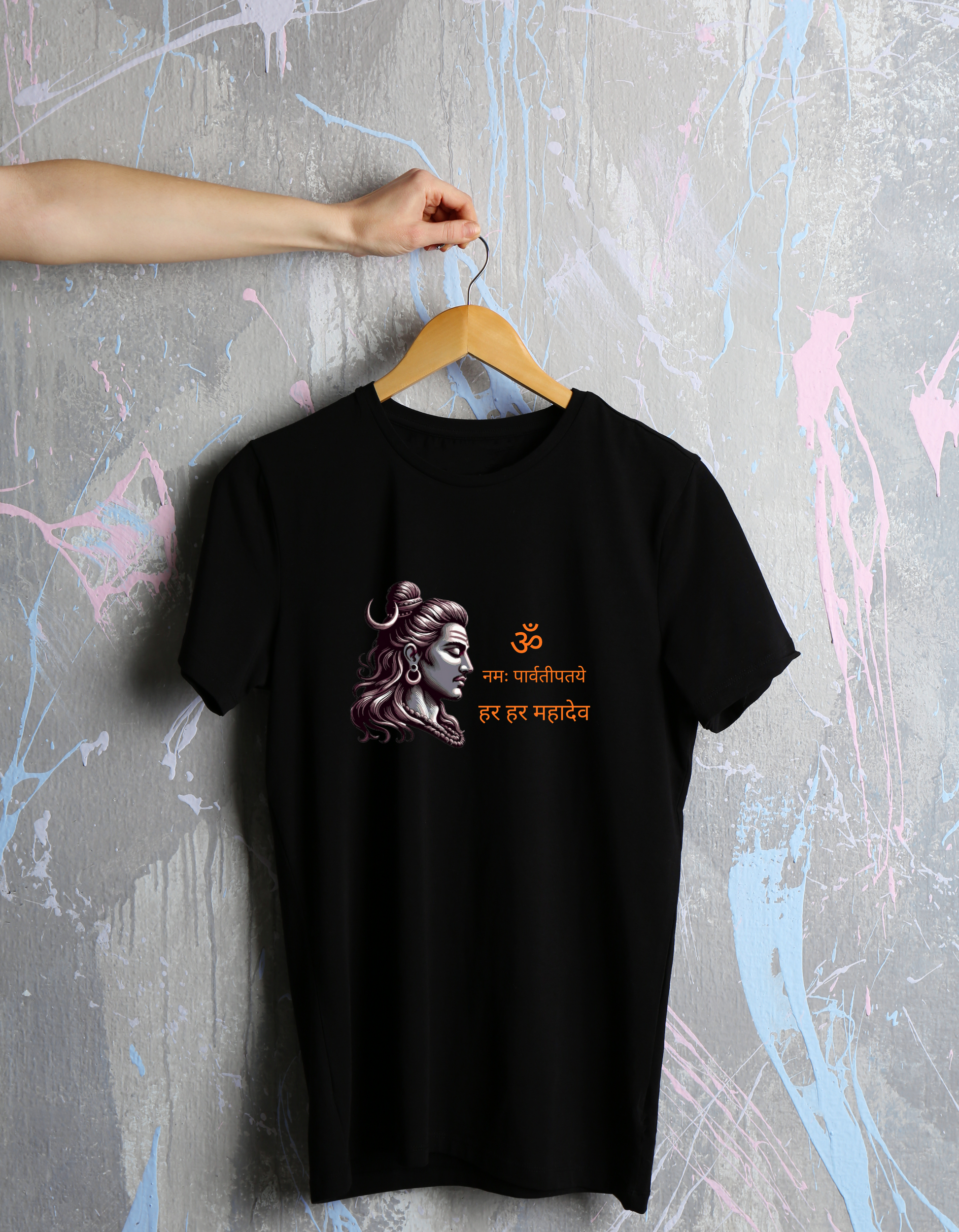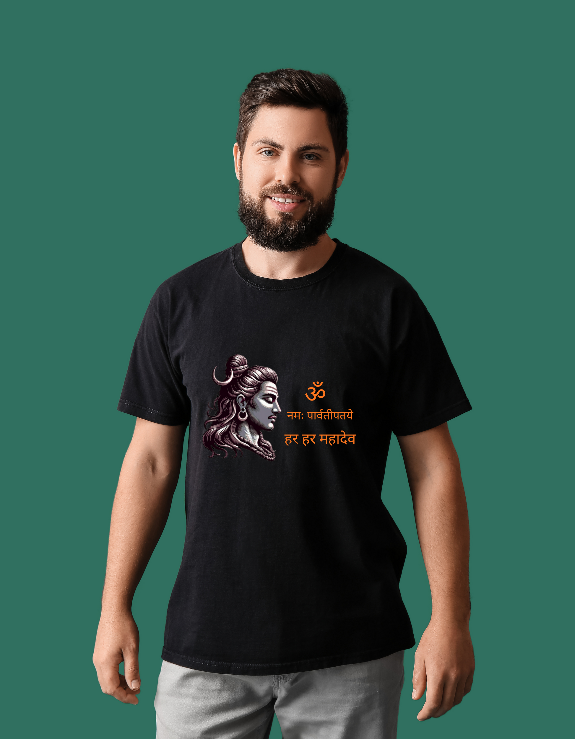 Invoke divine energy and spiritual strength with this powerful Lord Shiva graphic t-shirt, featuring a striking profile of Mahadev alongside the sacred Sanskrit mantra "ॐ नमः पार्वतीपतये हर हर महादेव".