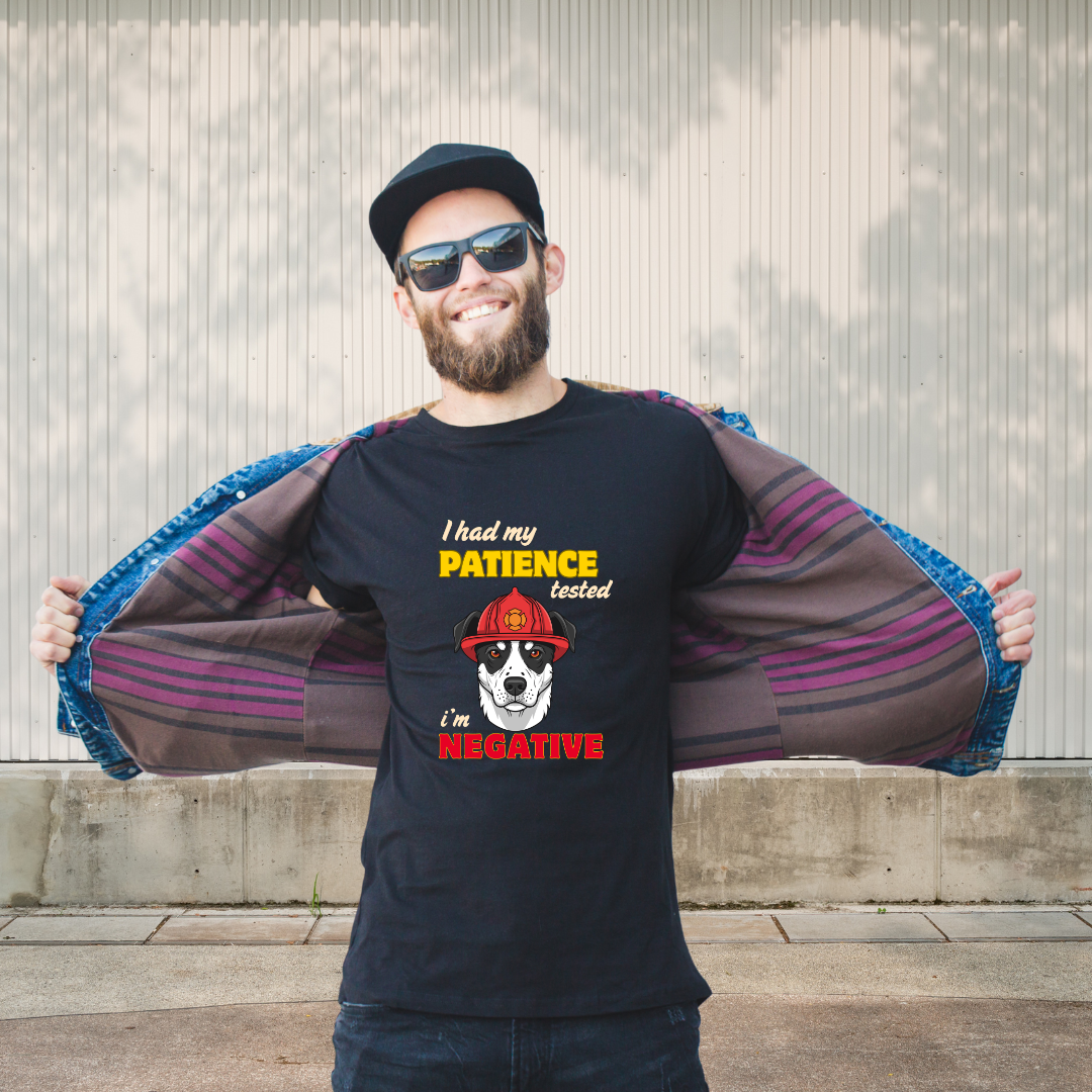 When patience runs out, wear it loud! This “I Had My Patience Tested – I’m Negative” T-shirt is the perfect mix of humor, sarcasm, and style. Featuring a bold dog illustration in a firefighter helmet, this witty design captures the ultimate mood of men who’ve had enough for the day.