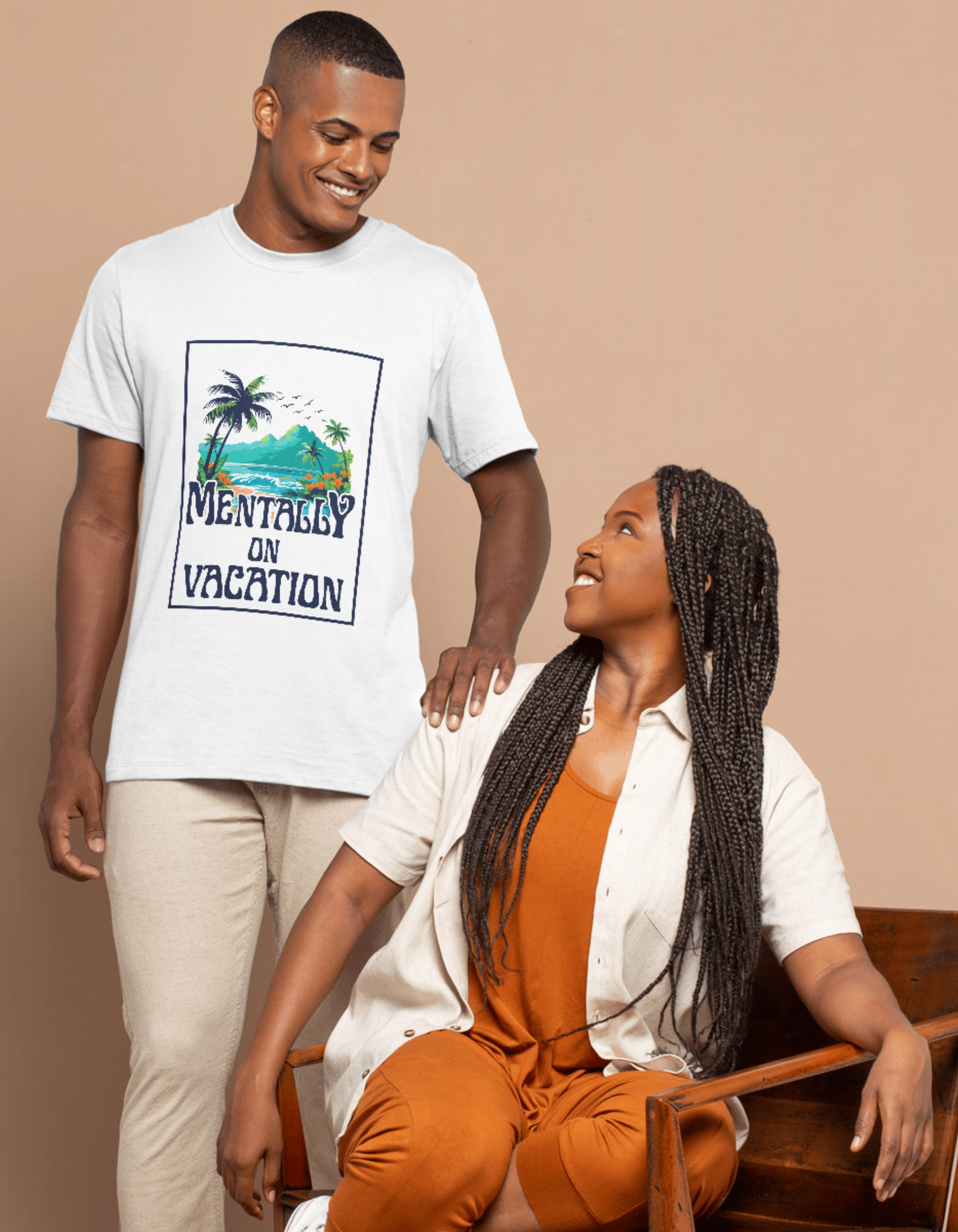 Escape the chaos without leaving your spot! This “Mentally On Vacation” t-shirt brings beachy vibes, palm trees, and tranquil waves straight to your wardrobe. Perfect for daydreamers, island lovers, or anyone who’s always one thought away from paradise.