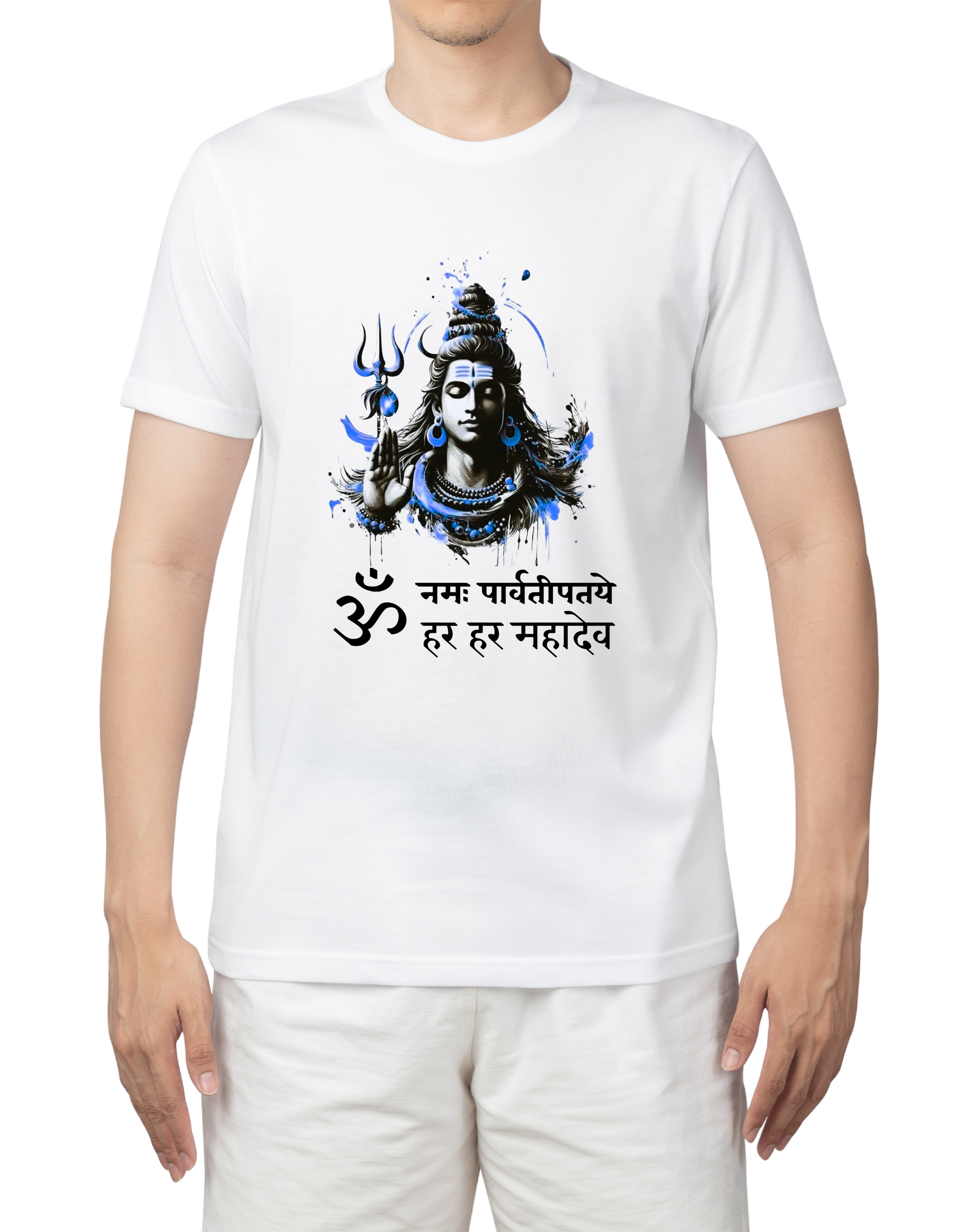 Invoke divine energy and timeless devotion with this striking Mahadev graphic tee. Featuring Lord Shiva in a powerful meditative form with the sacred mantra "ॐ नमः पार्वतीपतये हर हर महादेव", this design blends spirituality, art, and strength in one bold statement.