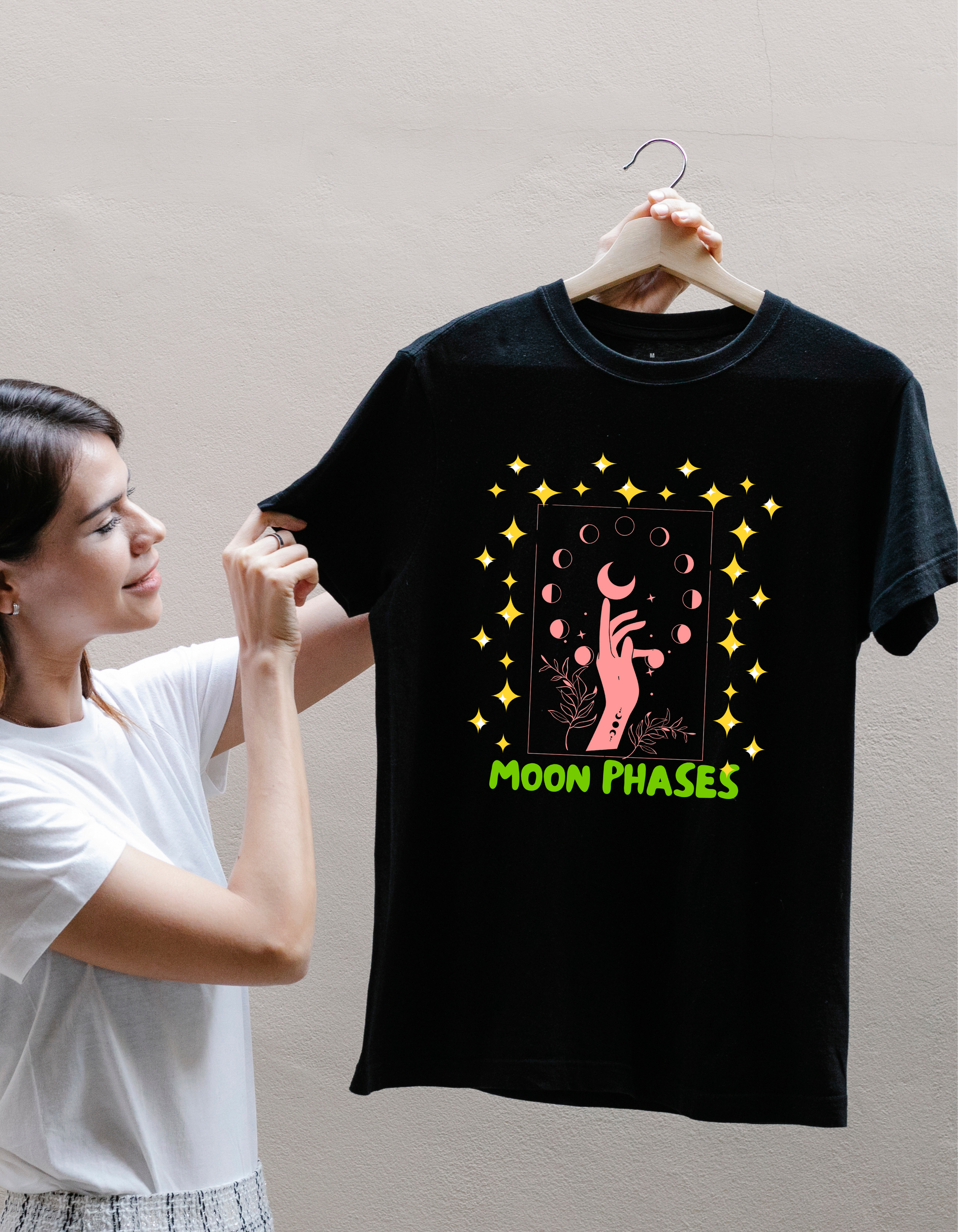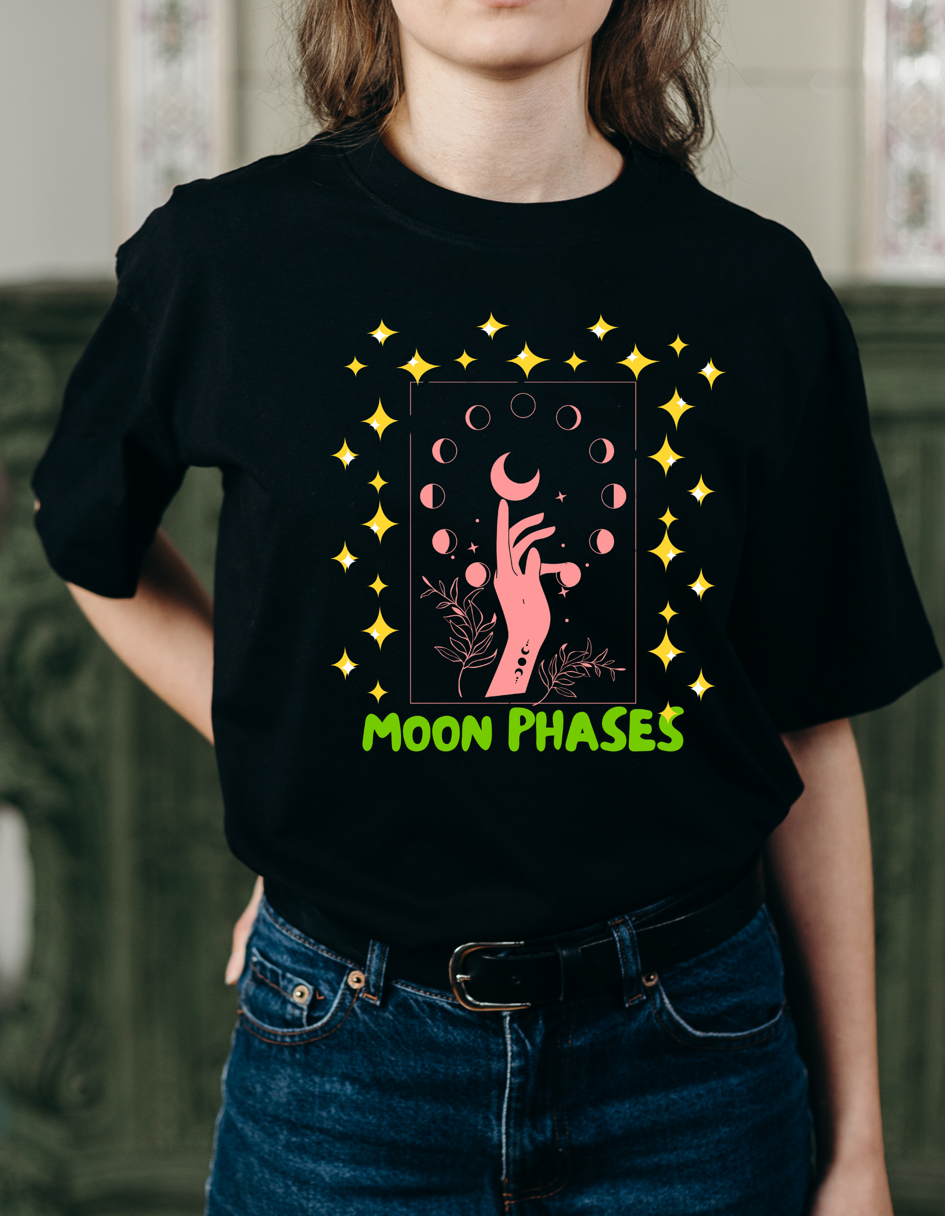 Embrace your celestial side with the Moon Phases tee — a stunning blend of art, magic, and lunar energy. Featuring a graceful hand reaching toward the moon surrounded by all its phases, this design is a tribute to the power of transformation and feminine energy.